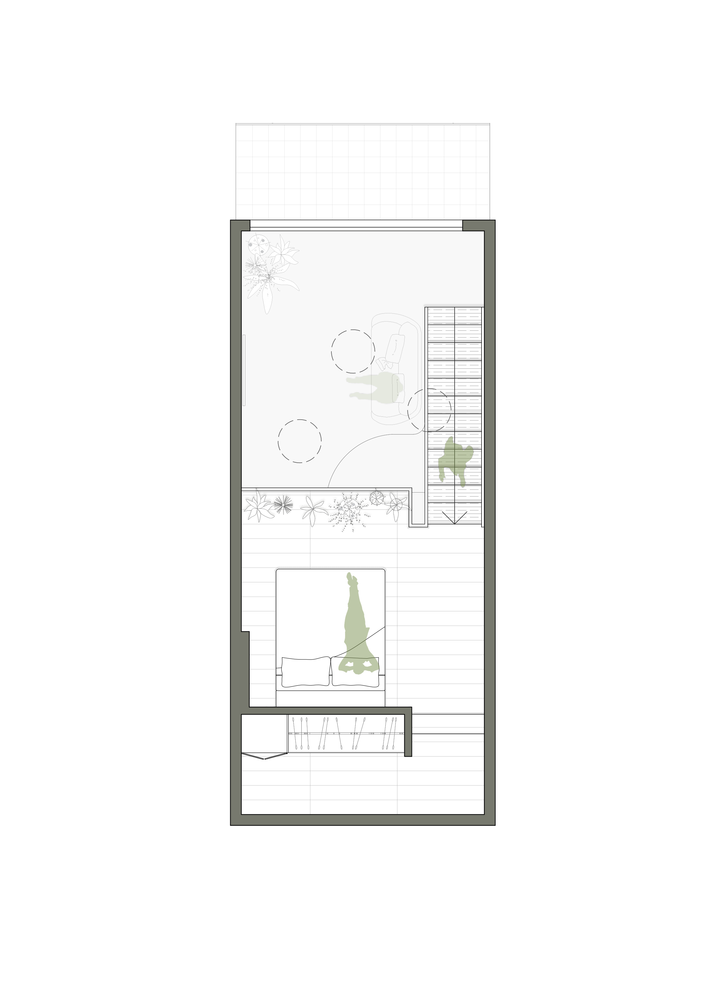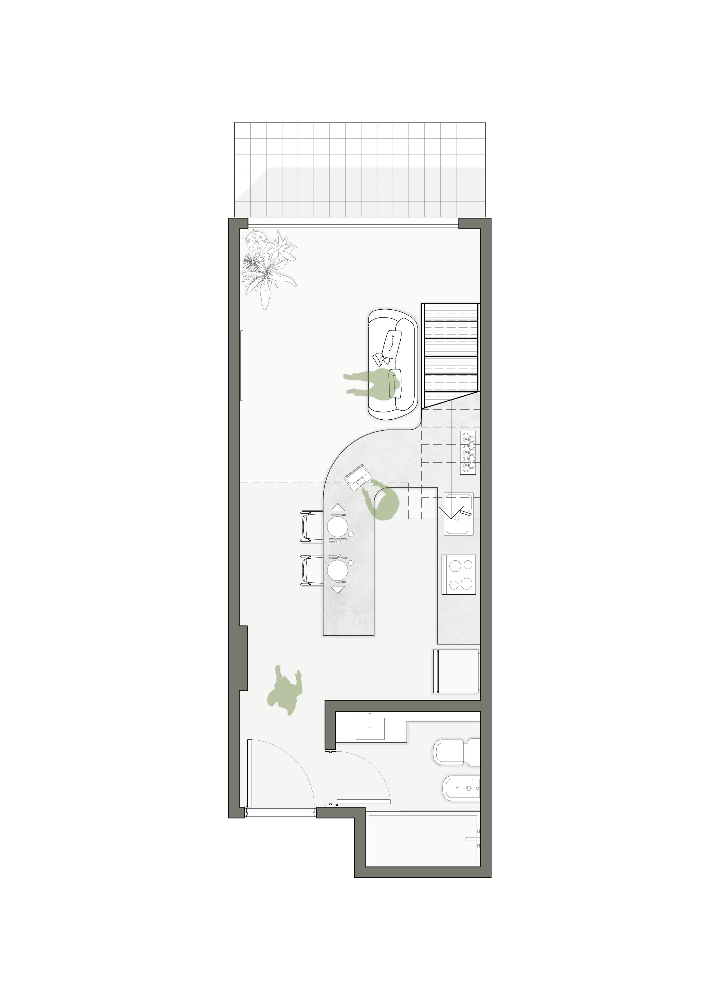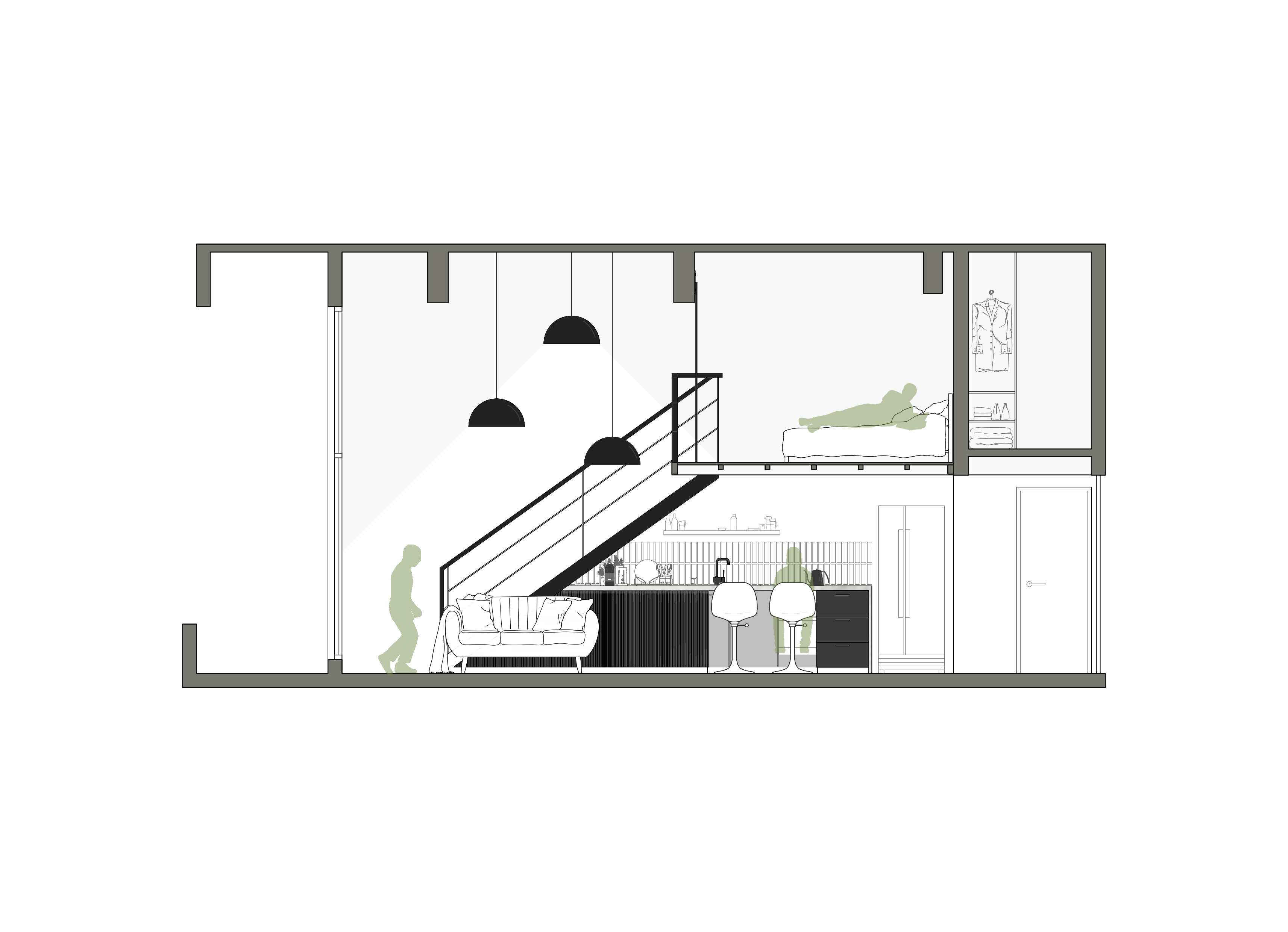 La intervención también busca crear una decoración sobria del espacio utilizando un revestimiento continuo de microcemento alisado tanto en el piso como en la mesada, vainillas de cemento en la pared de circulación y futura TV, una textura varillada en el mobiliario de living y muebles de textura lisa, todo en una gama de grises que permite complementar cualquier tipo de mobiliario futuro. Finalmente, en la planta alta se aprovechó un desnivel contra el fondo del departamento, que dejaba un espacio utilizable de solo 2.05 m de altura para colocar un vestidor incorporado al espacio de descanso ubicado en el entrepiso.